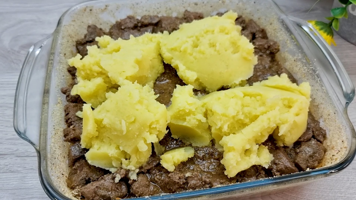 Форму для запекания смазать сливочным маслом и присыпать панировочными сухарями. На дно формы выложить половину картофельного пюре, мокрой ложкой равномерно распределить картофельное пюре по форме. На картофель выложить тушеную печень, сверху выложить оставшееся картофельное пюре, посыпьте весь верх панировочными сухарями и полить растопленным сливочным маслом, примерно 20 г. Отправить в духовку запекаться примерно на 30 минут при 180°С