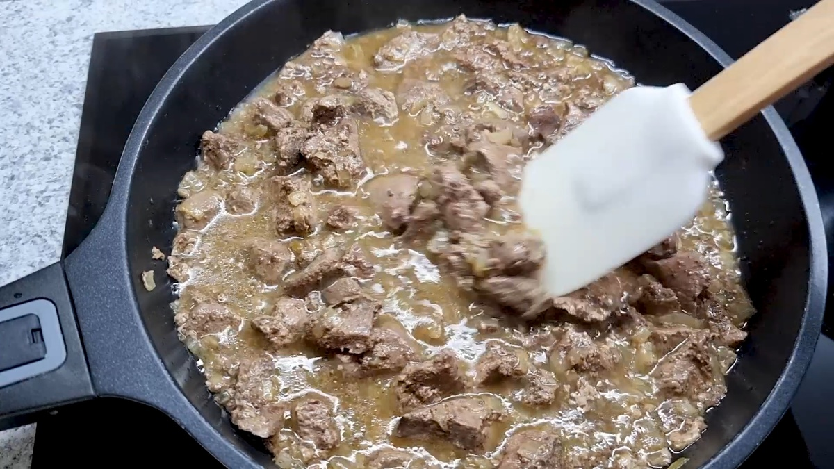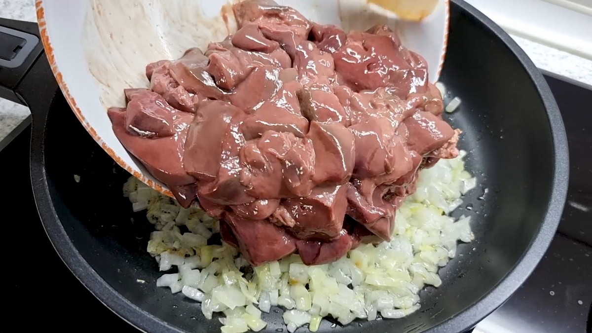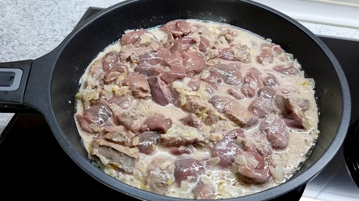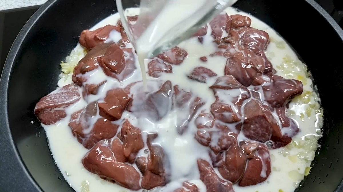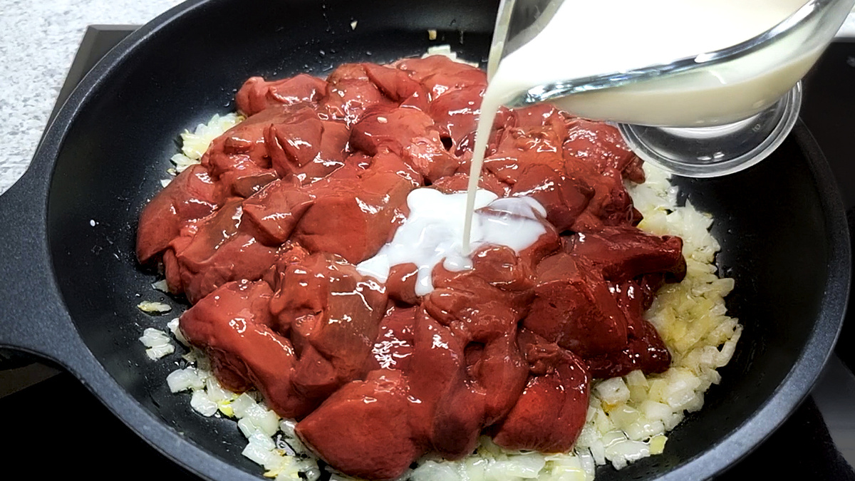 Покрошить 1 луковицу и жарить на растительном масле до прозрачности. 500 г свиной или телячьей печени нарезать на небольшие кусочки и добавить к луку в сковороду. Добавить примерно 150 мл молока или нежирных сливок и перец по вкусу, перемешать.Тушить на медленном огне под крышкой до готовности. За минут 5-10 до готовности посолить по вкусу