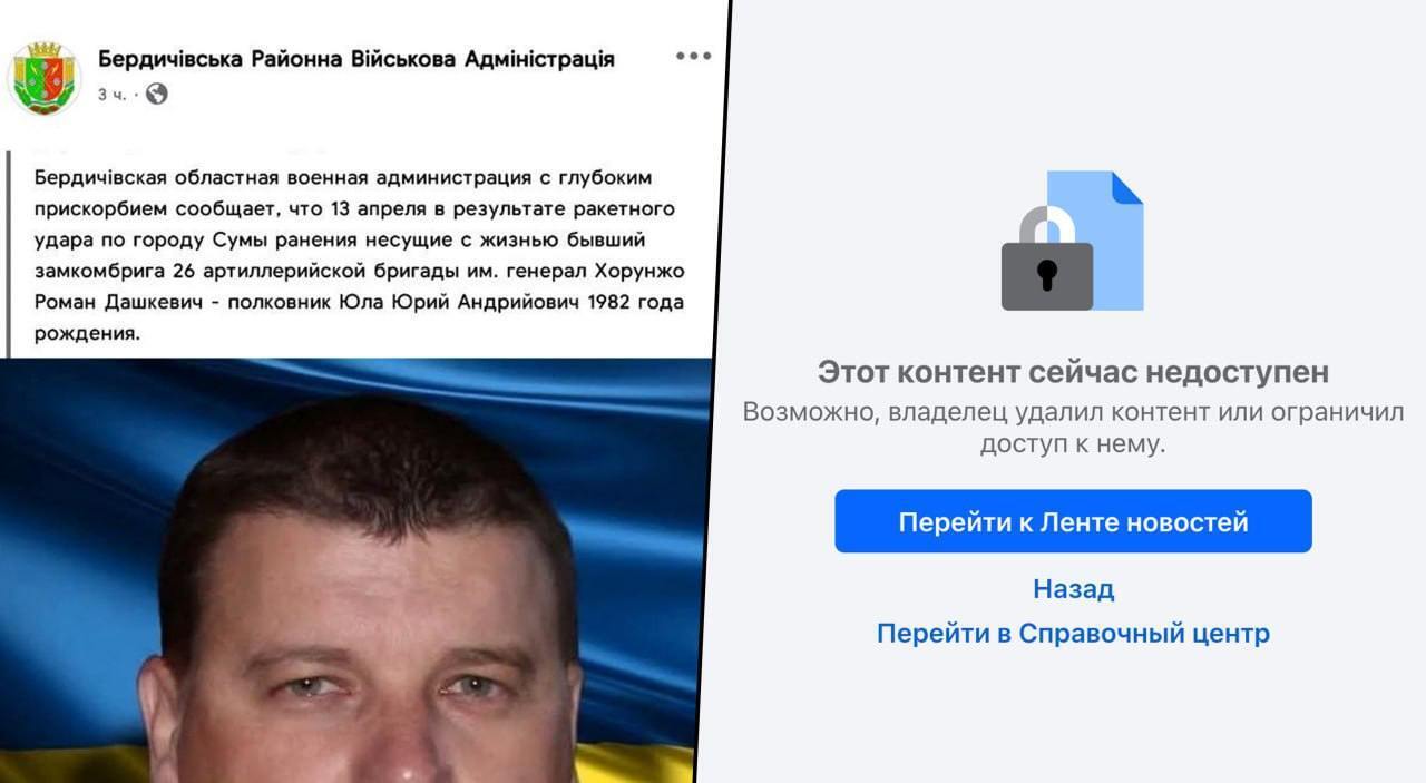 Сегодня же, как выяснилось, некролог о смерти полковника ВСУ Юрия Юлы, в результате прилёта в Сумах, потёрли. Данное сообщение было опубликовано на страницах Бердычевской районной администрации. Но парадокс - сейчас данного сообщения там нет.