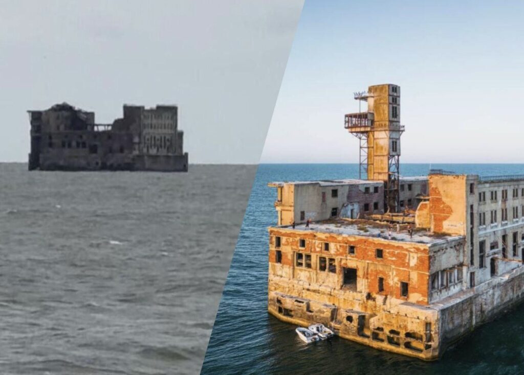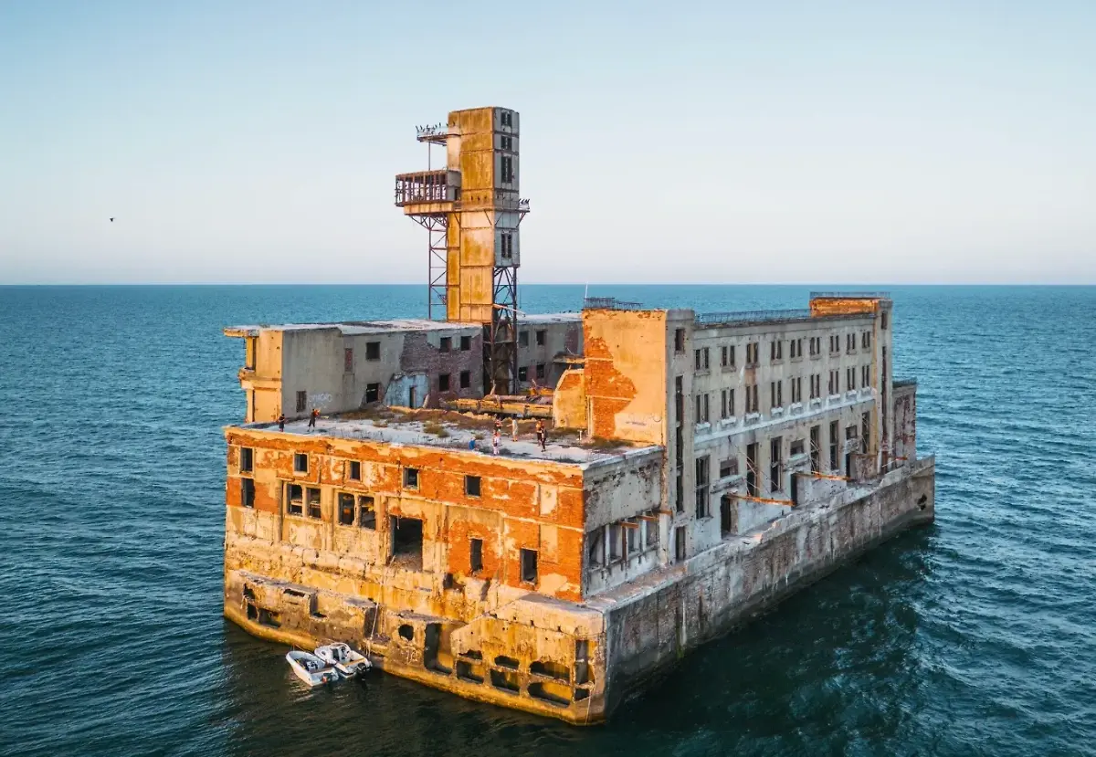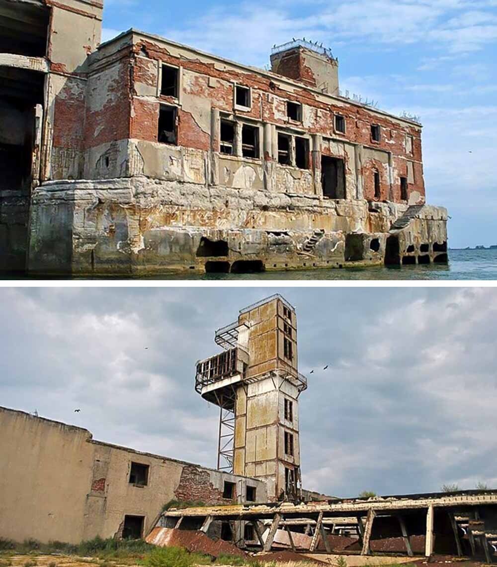 Туристическая достопримечательность Каспийска - заброшенный восьмой цех военного завода, находящийся в более чем 2 километрах от береговой линии и куда любили плавать на катерах туристы, теперь остался без башни.