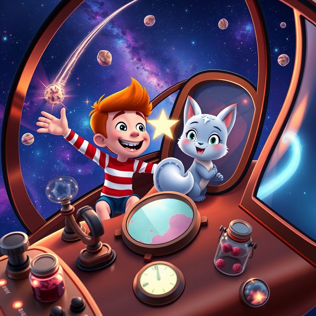 Дедушкин телескоп оказался космическим кораблём. Заправив его малиновым вареньем (лучшим горючим, по словам деда), друзья отправились в путь.