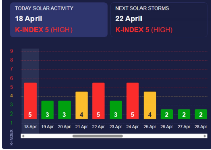 Согласно последним данным прогноза, вероятность магнитных бурь 20 апреля выставлена на уровне всего 7%. Это означает, что риск возникновения каких-либо серьёзных магнитных возмущений в течение этого дня практически минимален. Магнитные бури измеряются по шкале от 1 до 5, где 1 обозначает малую бурю, а 5 — крайне сильную. Прогноз на этот день указывает на уровень 3, что также говорит о достаточно спокойной солнечной активности.
