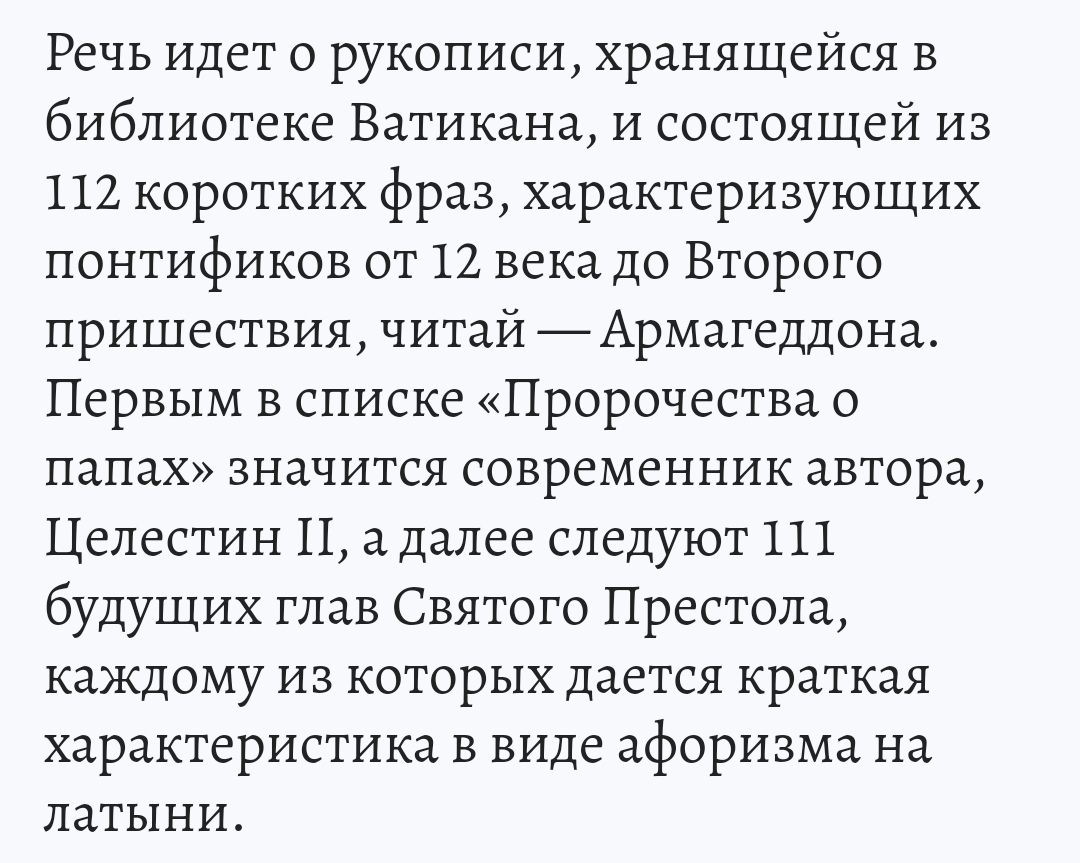«Пророчество о 112 верховных понтификах» Святого Малахии, архиепископа из Северной Ирландии. Подробнее ➤