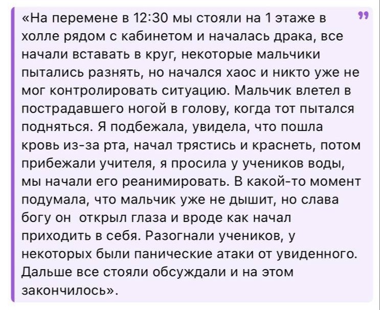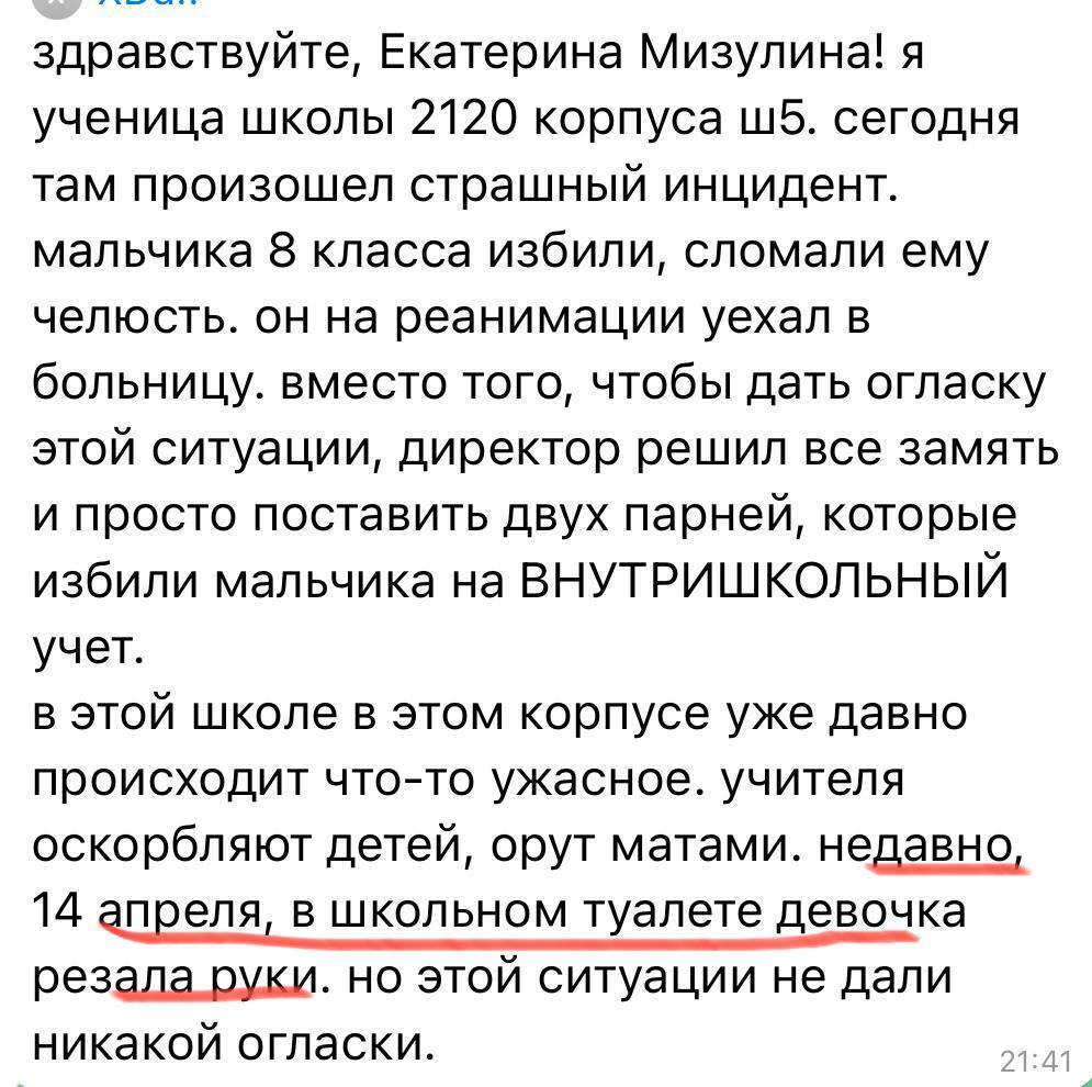 Екатерина Мизулина в своём ТГ-канале выложила многочисленные обращения учащихся и их родителей. Все они просят разобраться в ситуации. Пишут, что при попустительстве школьной администрации такие случаи уже не являются редкими в этом учебном заведении.