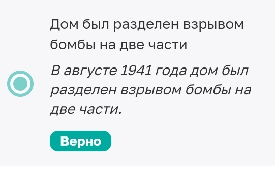 Правильный ответ: Дом был разделен взрывом бомбы на две части.