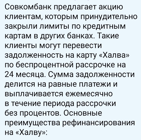 Но справедливости ради стоит ещё добавить, что несмотря на такие "жёсткие" высказывания представителя банка "Уралсиб"- кредитки 120 дней без % этот банк ещё продолжает выдавать новым и старым своим клиентам, а вот "Альфа-Банк" выдавать кредитки 100 дней без % уже прекратил в прошлом году))