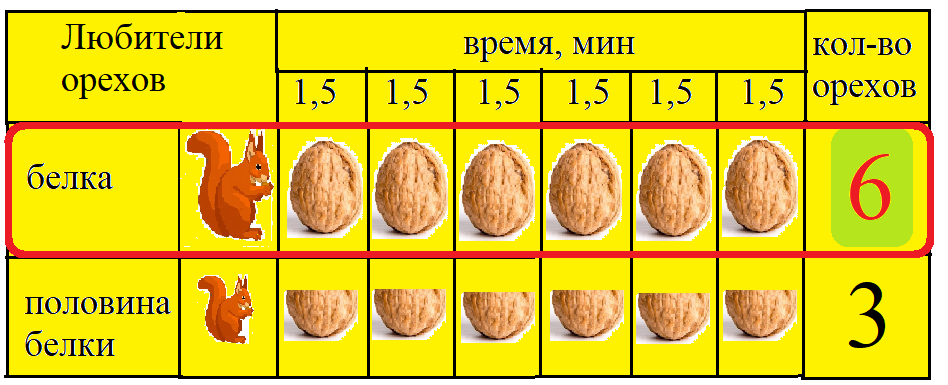 1,5 белки - 1,5ореха - 1,5 минуты; 1 белка - 1 орех - 1,5 минуты; 9 белок-9 орехов - 1,5 минуты, следовательно за 9 минут без изменения количества белок количество орехов увеличится в 6 раз. 9х6=54 ореха.