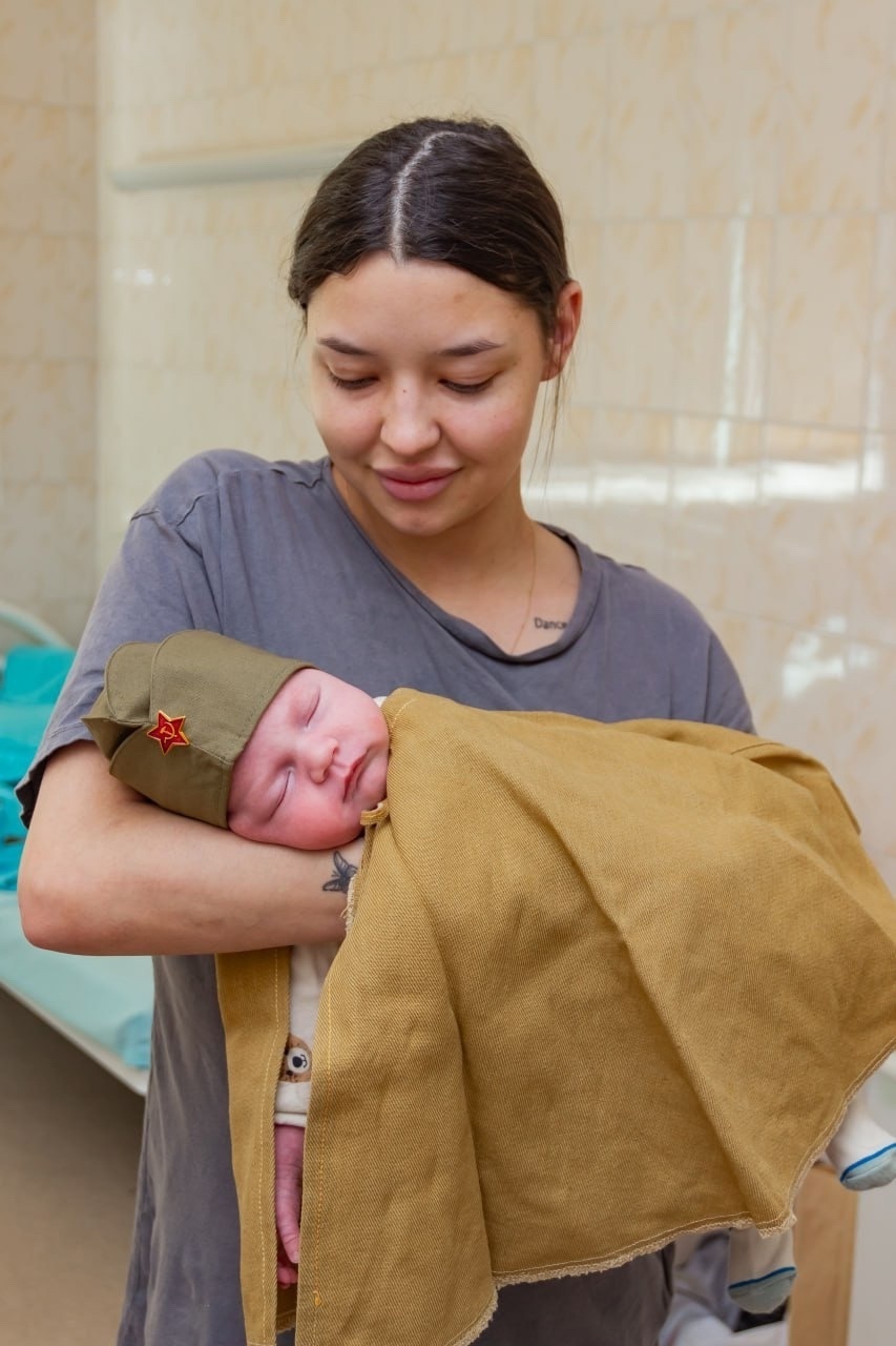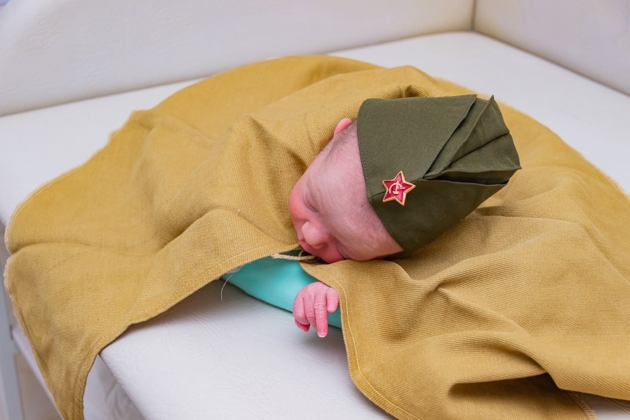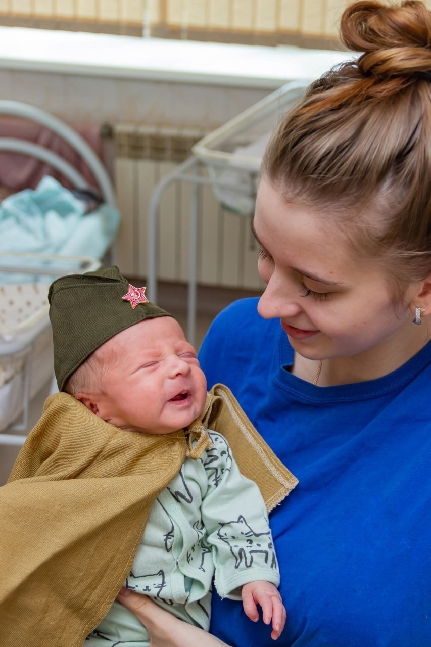 В кемеровском роддоме появилась трогательная традиция: к 80-летию Победы новорожденных выписывают из роддома не только в красивых конвертах, но и в крошечных пилотках и плащ-палатках.