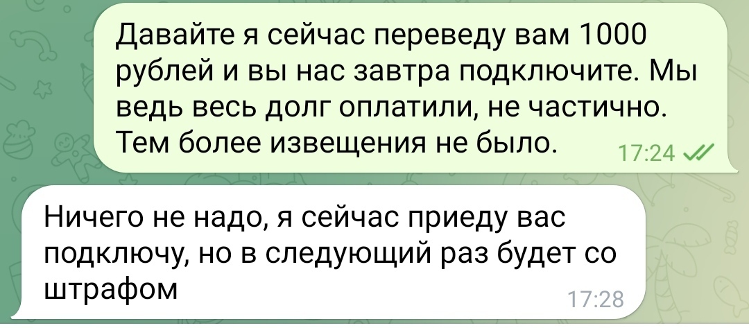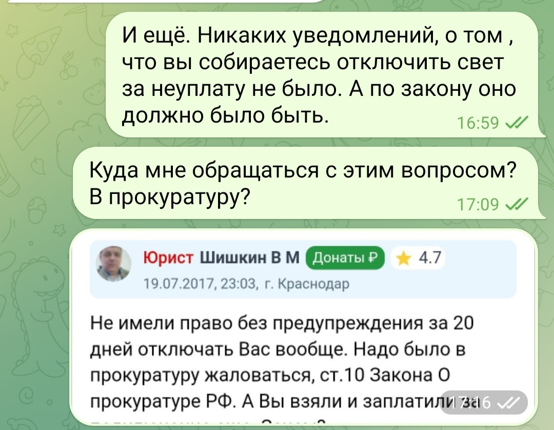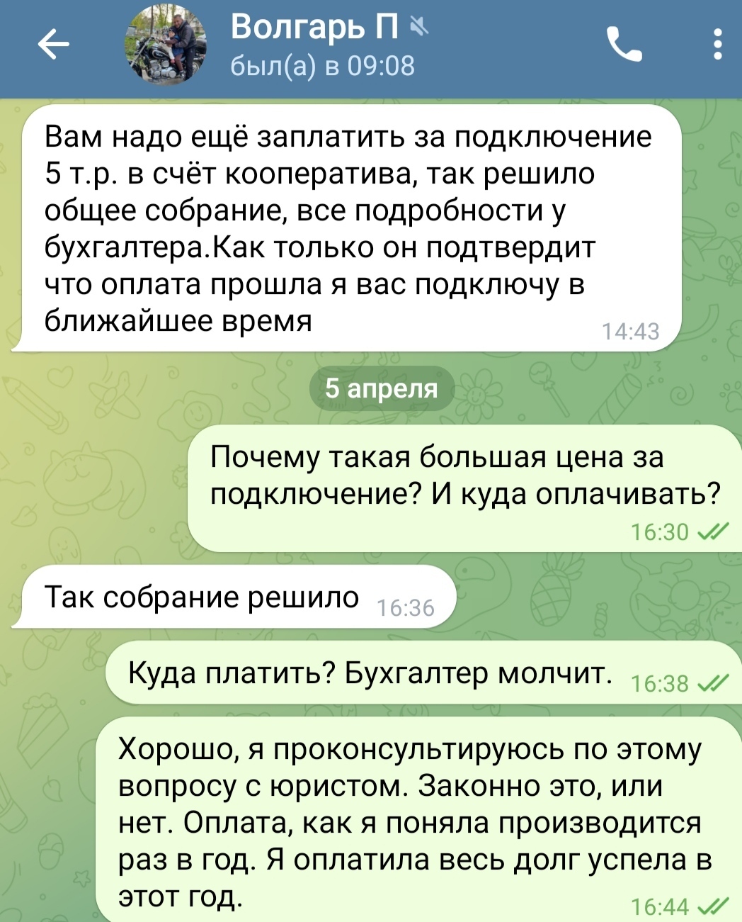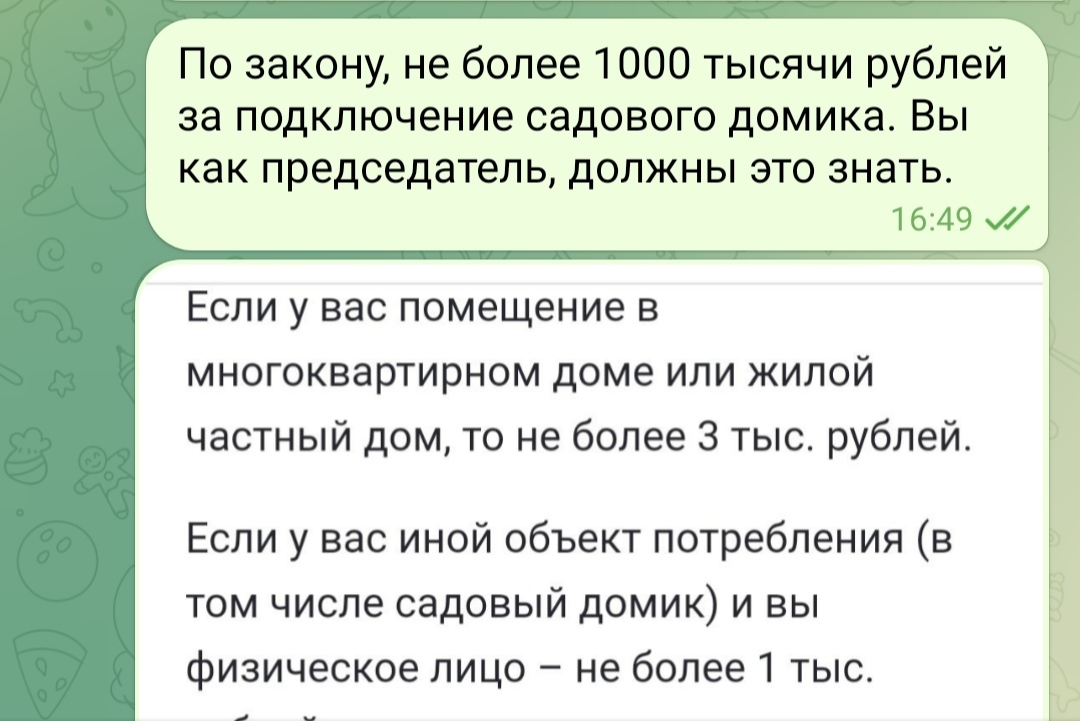Пока лежала в лор-отделении, пришло сообщение в телеге от председателя дачного кооператива, о том, что свет отрезали от нашего дачного домика. Требования за обратное подключение меня обескуражили и привели в бешенство. Вот мой диалог с председателем: