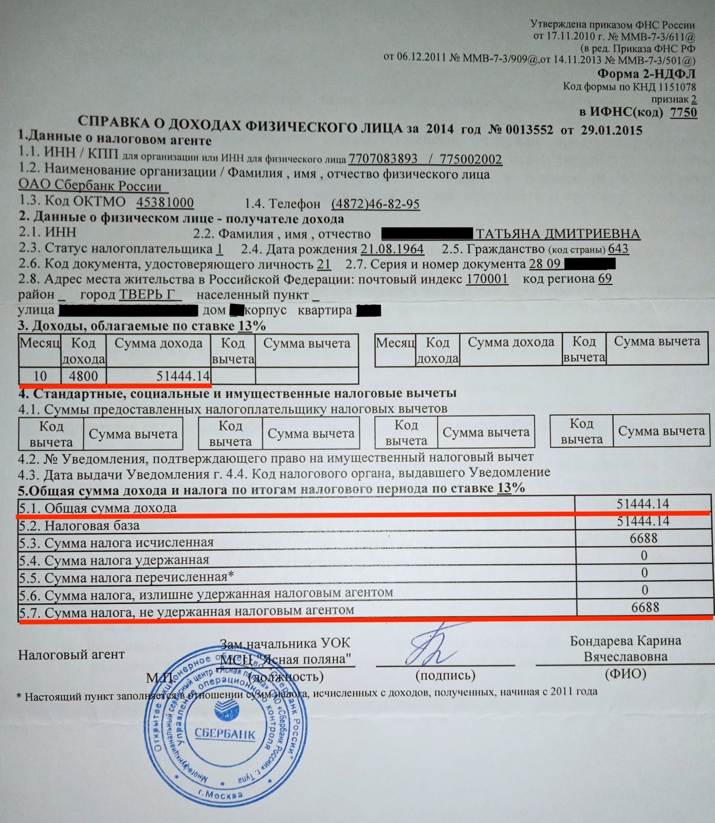 В справке 2-НДФЛ, как видим, имеется живая печать Сбера, а не только подпись налогового агента...