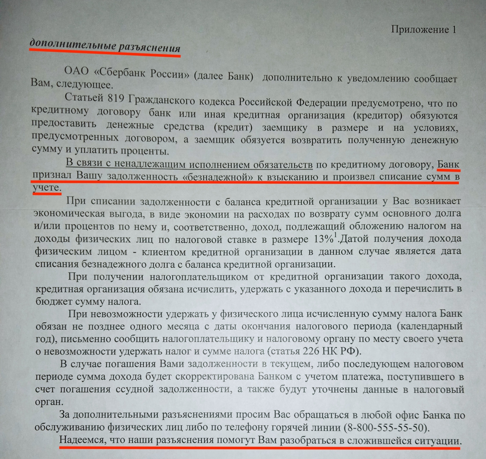 Третьим листочком в письме от Сбербанка было дополнительное разъяснение о том, что Сбер признал мою задолженность "безнадёжной" к взысканию и произвёл списание сумм в учёте.