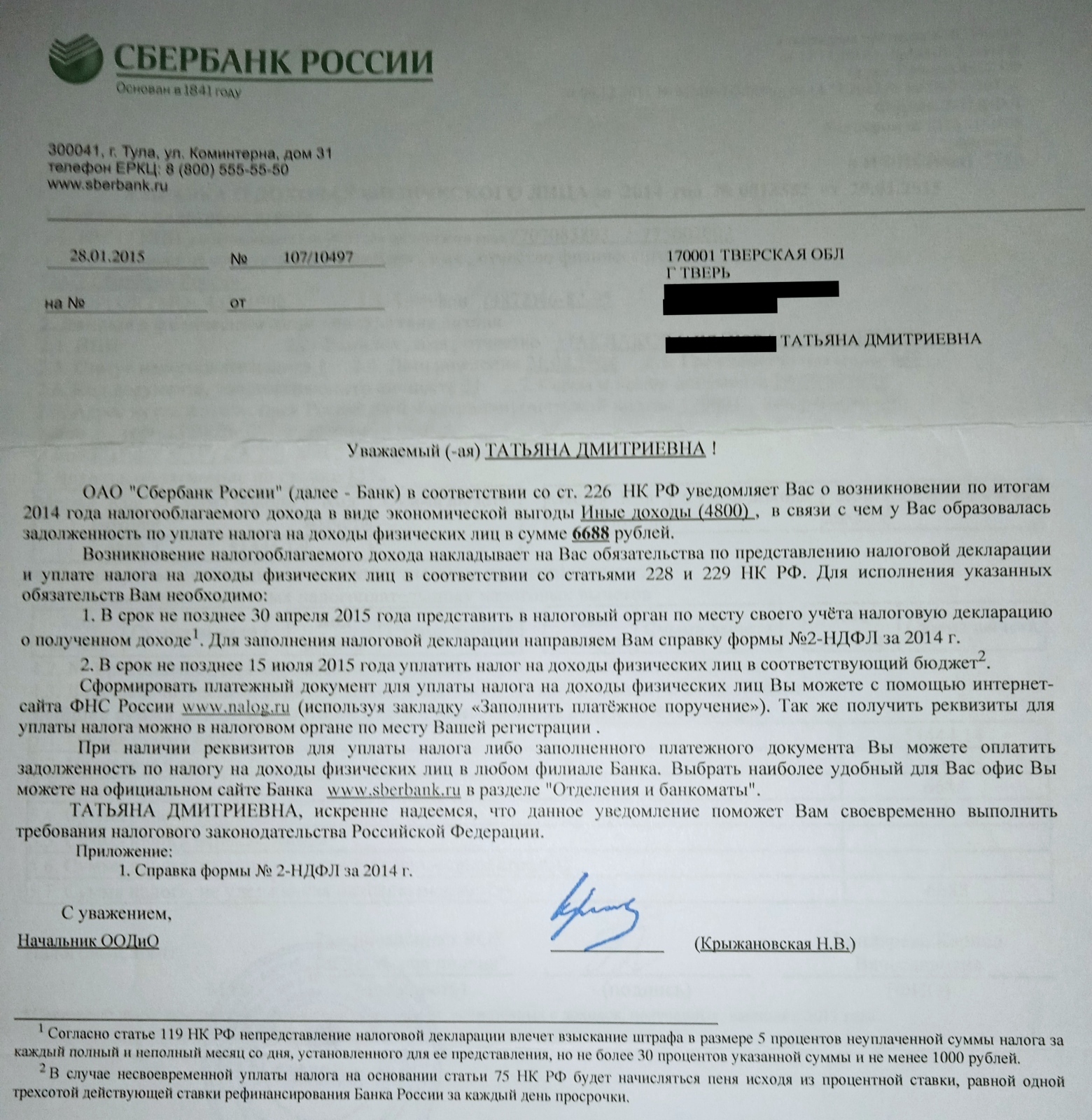 Обратите внимание, что уведомление от Сбербанка России фигурирует 28 январём 2015 года. То есть фактически прошло более 10 лет. Также уведомление является прямым доказательством, что Сбер знал о том, что на его счета не поступают ежемесячно денежные средства от заёмщика Татьяны Дмитриевны из Твери. То есть срок исковой давности (СИД) и надо исчислять от этого самого уведомления. При отсутствии, конечно, в дальнейшем платежей от меня. А оплачивать мне было нечем...