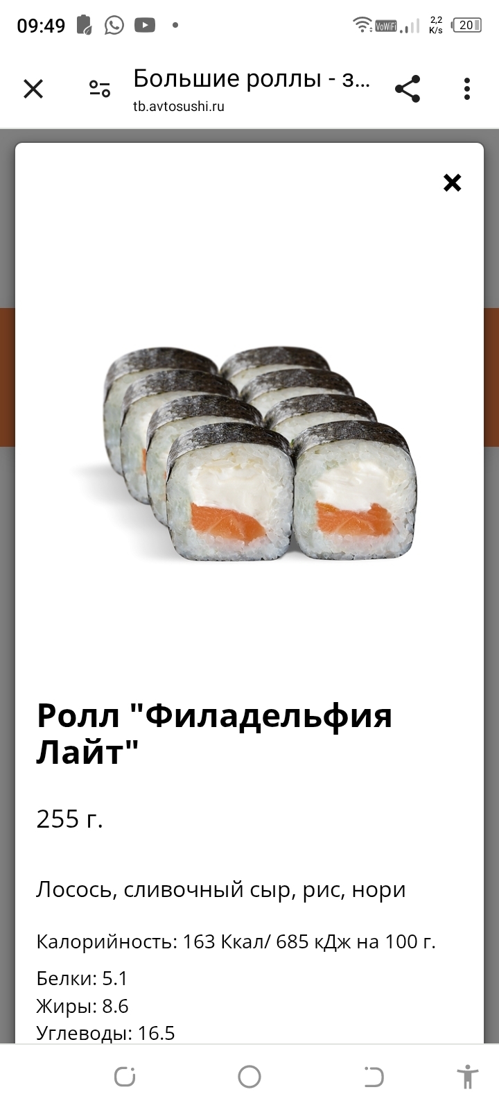Перед вами ролл Филадельфия лайт, состав увидите чуть ниже и заодно сравните реальность и картинку. Кстати, в виртуальном меню сайта указано, что картинка может не соответствовать блюду. Предусмотрительно. А теперь перед вами скриншот с сайта. Есть отличия?