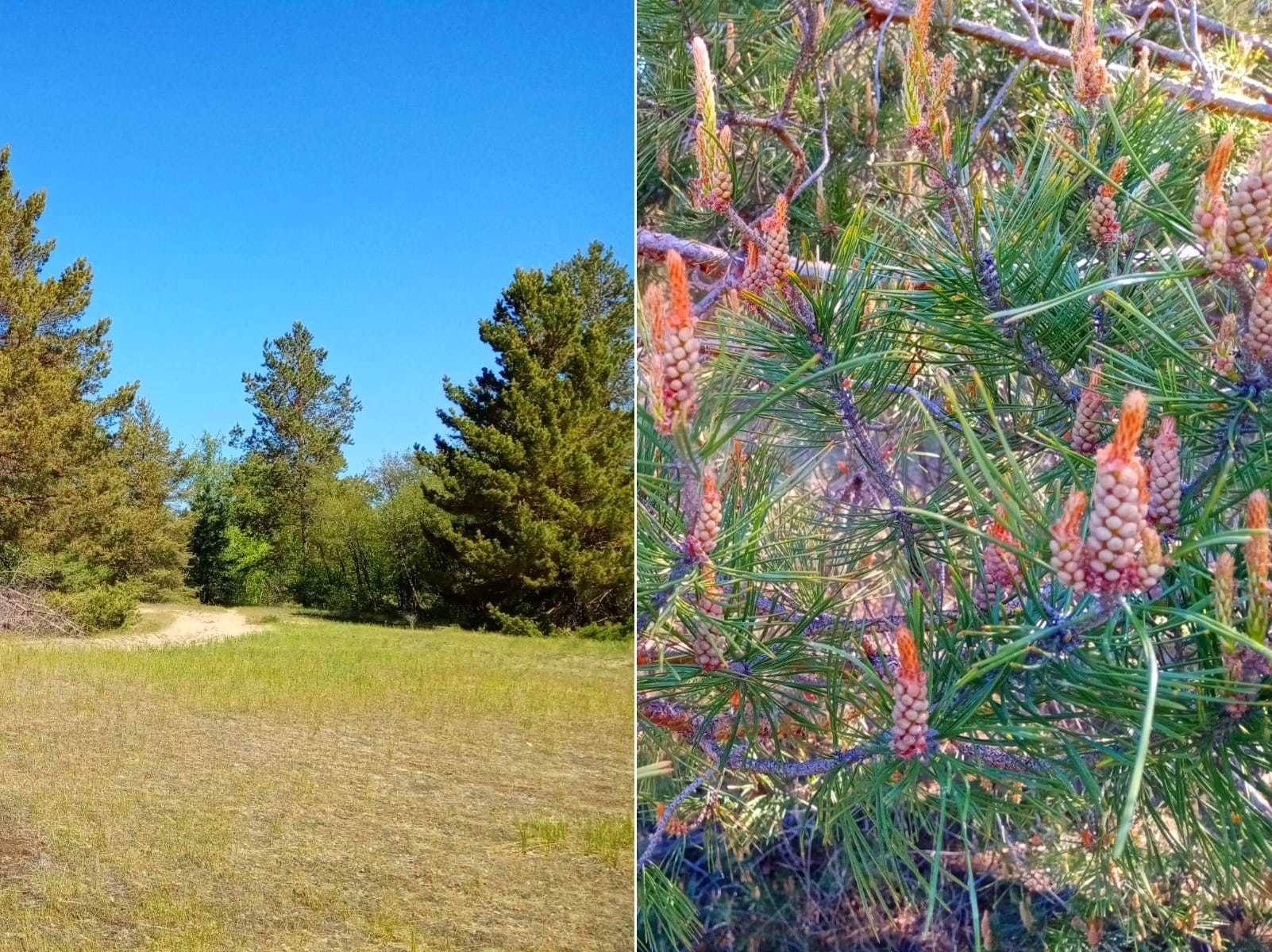 Пока добирались туда на машинах, любовались природой. Там много сосновых лесов. Сейчас время цветения сосны.