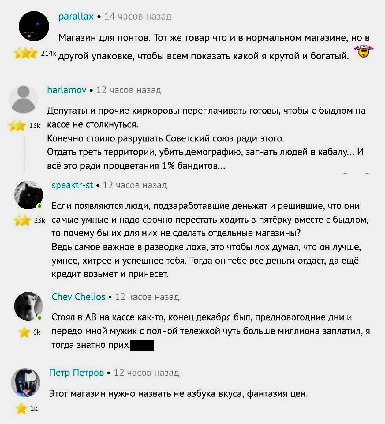 Среди пользователей Сети совсем не оказалось платёжеспособных гурманов, но они почему-то осудили в первую очередь не сам магазин, а чванливых покупателей, щедро кормящих хитросделанных барыг.