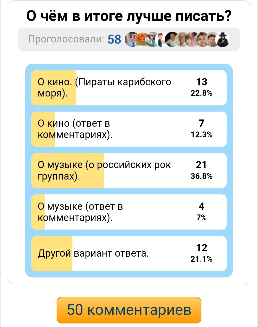 Вчера, в 13:00 на данном сайте я выложил статью про дальнейшее моё участие по сути. Конкретно о чём писать тут дальше. И по результатам голосования (скриншот ниже прикрепляю), вперёд проходит наши рок-группы. В данном случае это у нас: "Кино", "Сектор Газа", "Король и Шут".