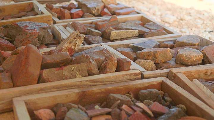 При раскопках были обнаружены монеты, остатки оружия, черепки керамики и фрагменты стекла, но наиболее преобладающими находками являются плитки, найденные в чрезвычайно больших количествах.