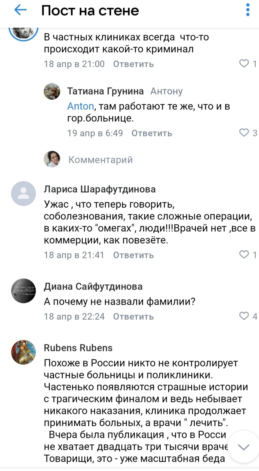 Погибшая пациентка сама являлась сотрудницей филиала «Омега клиник». Её плановая операция состоялась 21 марта, а 5 апреля произошла трагедия и женщины не стало. Вот что говорит её отец по поводу случившегося: