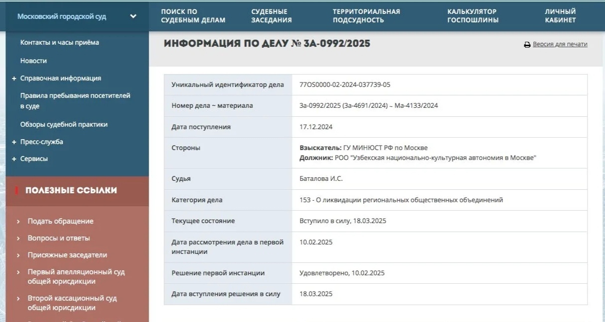 Уважаемые читатели, а знаете ли вы, что Мосгорсуд ликвидировал узбекскую диаспору? Причина ликвидации – неоднократные и многочисленные нарушения законодательства Российской Федерации, которые были выявлены в ходе проверки по иску Минюста РФ (подан 17.12.2024).