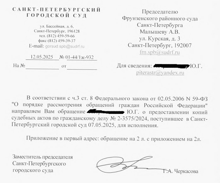 с районного суда ничего не пришло (обращение подано 07.05.2025) до судьи моего дела (Рачева) не дозвониться(звоню каждый день). Дозваниваюсь до канцелярии там обещают что то сделать или узнать и пока ничего....Жду...