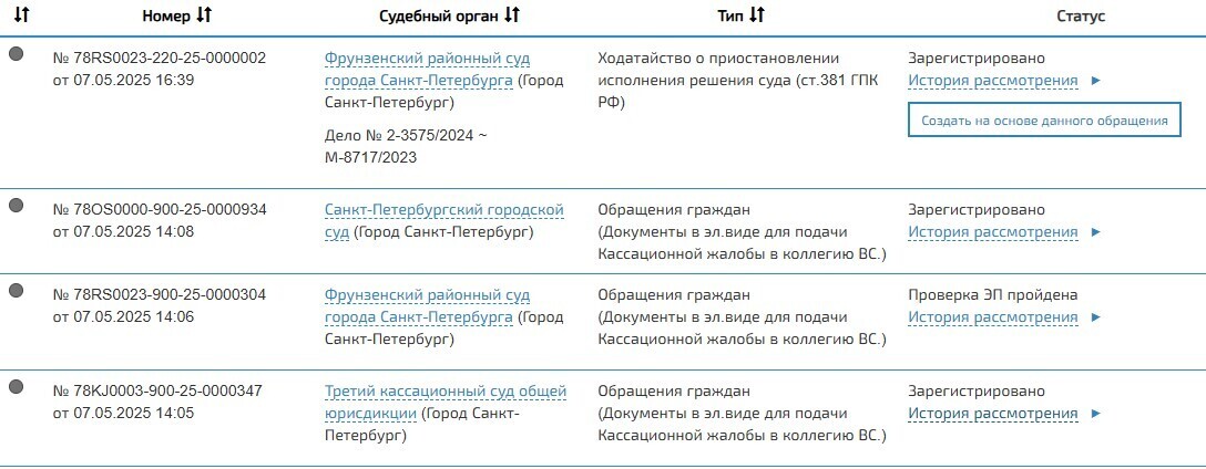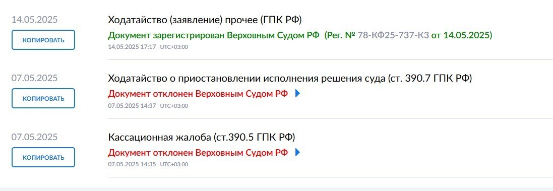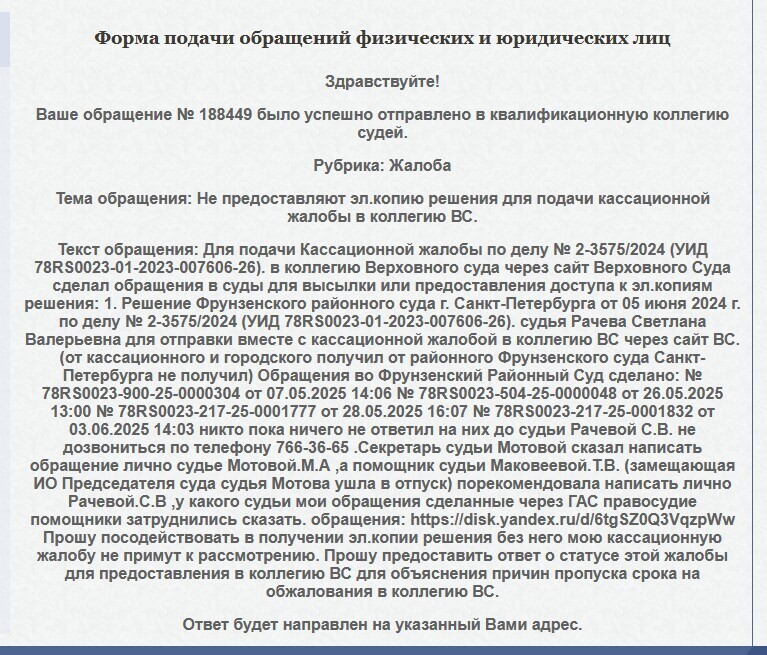 07.05.2025 отправил обращения через ГАС правосудие в районный ,городской и кассационный суд чтобы мне выслали такие документы чтоб я их мог на сайте ВС подать вместе с кассационной жалобой в коллегию ВС.