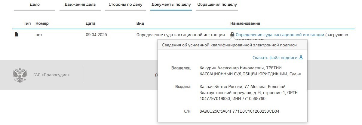 15.05.2025 в ГАС правосудие было загружено Кассационное Определение с файлом эл.подписи SIG ,а Апелляционное Определение уже там было еще с прошлого года я просто не знал ,что оно с эл.подписью .Чтобы скачать эл.подпись надо нажать на значок чемоданчика (об этом нигде не написано)