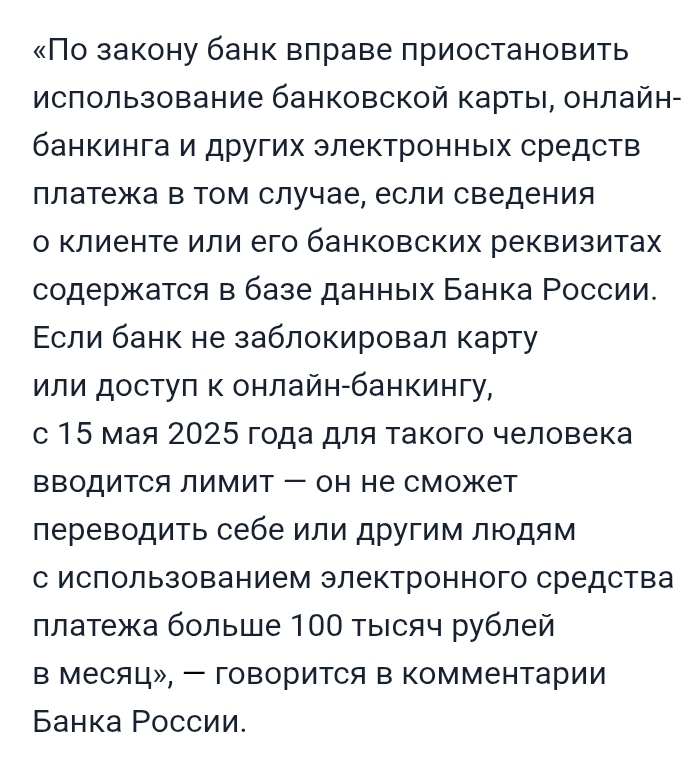 ЦБ вводит ограничение на переводы — не более 100 тыс. рублей в месяц, пока это касается лишь дропперов