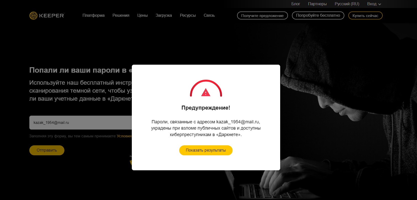 Некоторые эксперты советуют выполнить бесплатное сканирование даркнета. По этому совету я попробовал на бесплатном сайте https://www.keepersecurity.com/ru_RU/ провести сканирование. Вот что получилось: