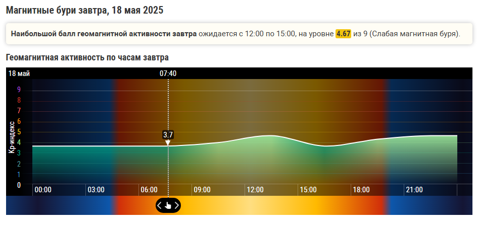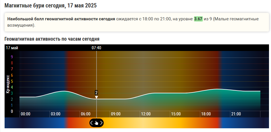 По информации, предоставленной специализированными изданиями, в субботу, 17 мая, геомагнитная обстановка претерпит изменения. До 11:00 КП-индекс (показатель геомагнитной активности) останется на спокойном уровне в три балла. Однако, после полудня ожидается его повышение до четырёх баллов.