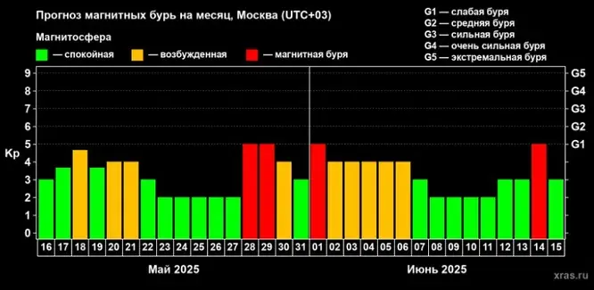 Прогнозы на 17-18 мая 2025 года указывают на возможность сильной магнитной бури. Связано это с тем, что в последние месяцы на Солнце наблюдалась повышенная активность, зарегистрировано множество вспышек класса X (самые мощные). Потоки заряженных частиц от этих вспышек, как ожидается, достигнут Земли именно в середине мая, спровоцировав геомагнитные колебания.