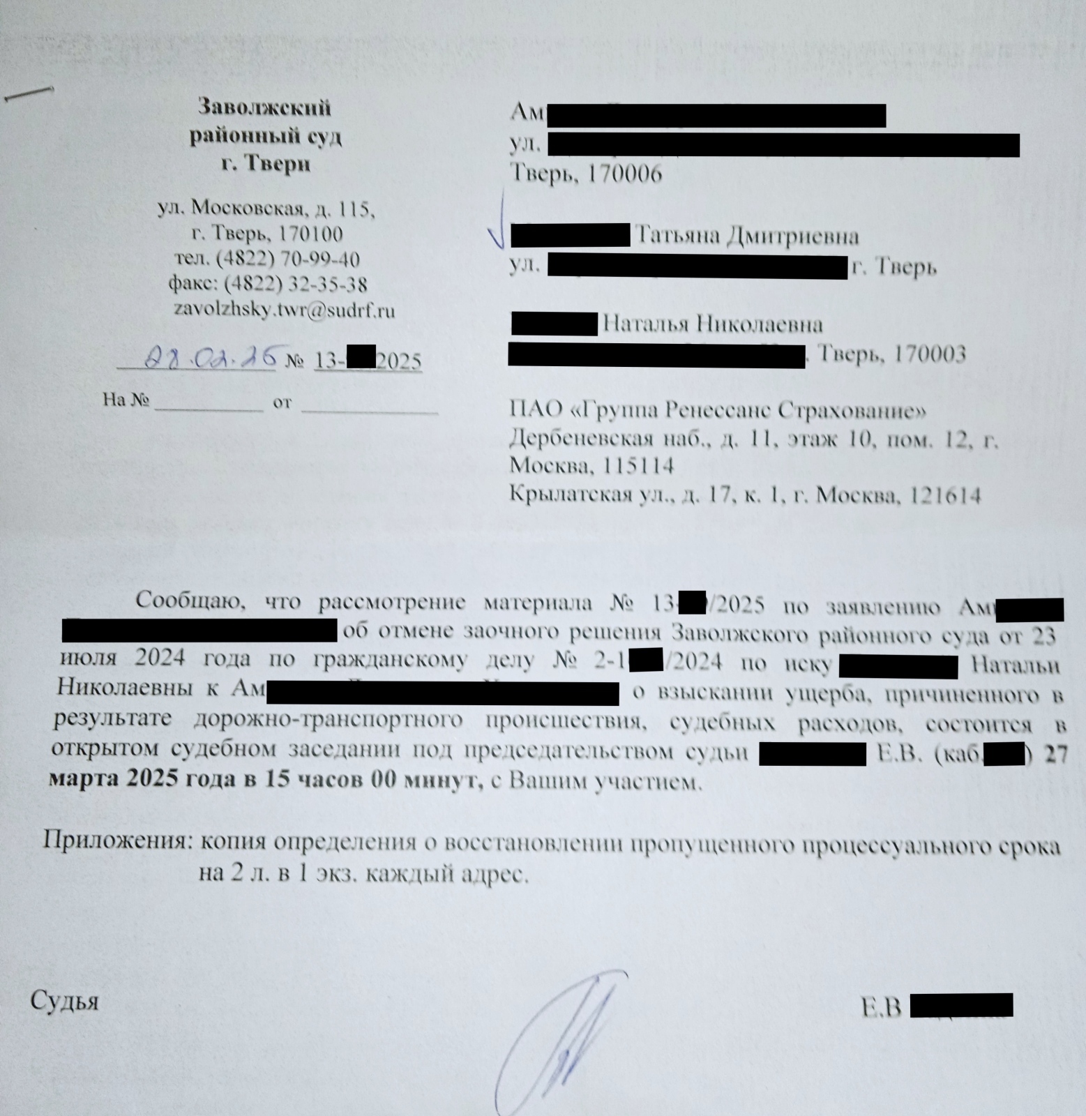 Оказала помощь в восстановлении срока обжалования заочного решения суда, отменив его впоследствии: так же представляла в суде интересы ответчика по устному заявлению.