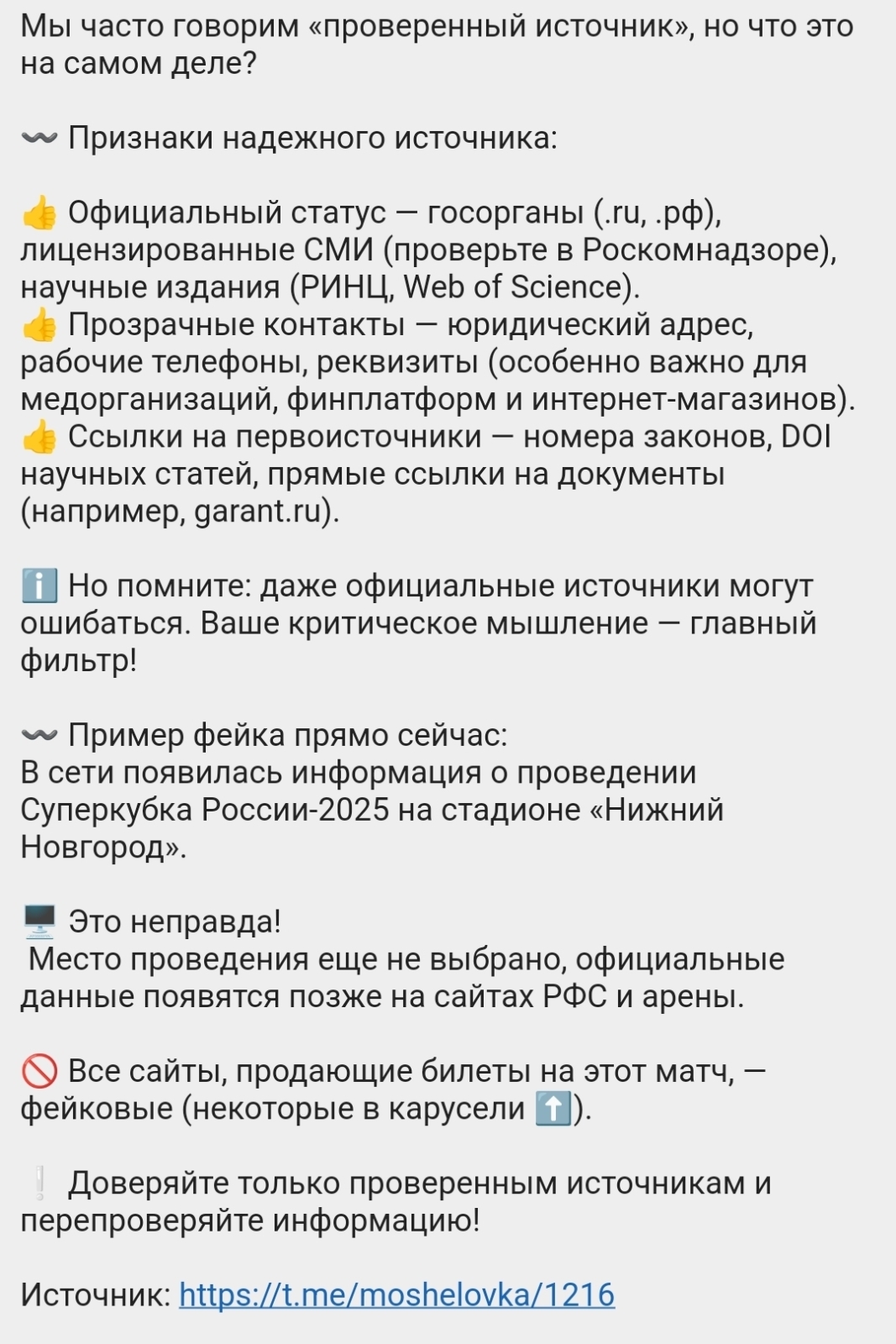 Канал Мошеловка https://t.me/moshelovka/1216 опубликовал признаки надежного (проверенного) источника: