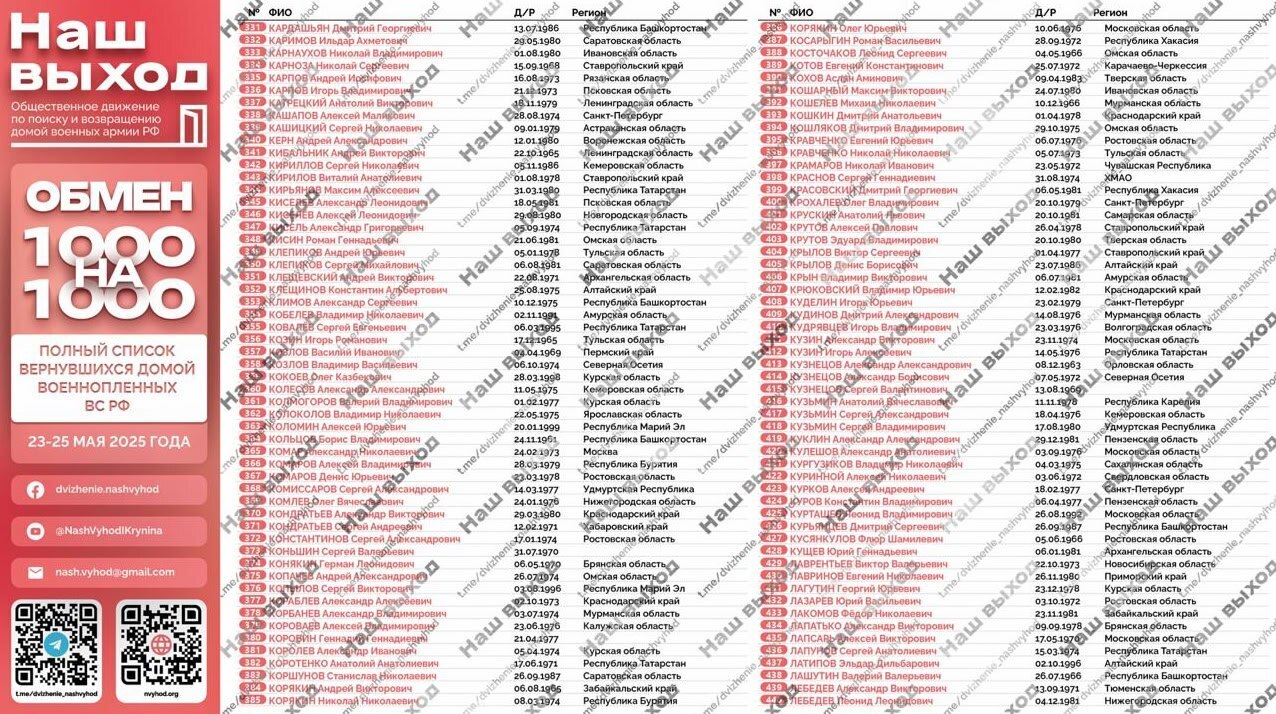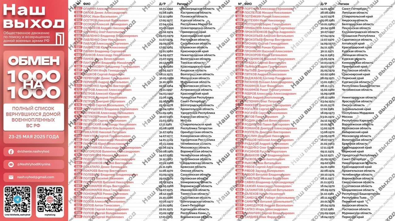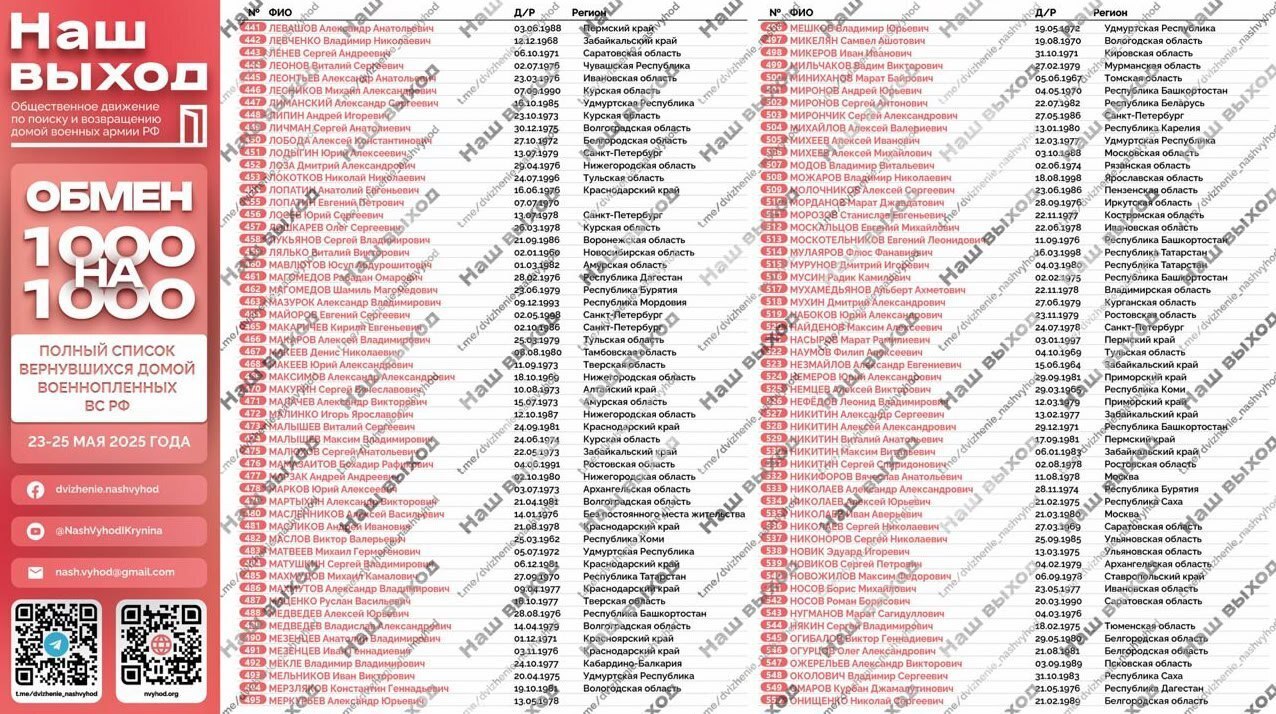 Опубликованы списки крупнейшего обмена пленными 1000 на 1000, который шел три дня : 23,24 и 2 5 мая 2025года.