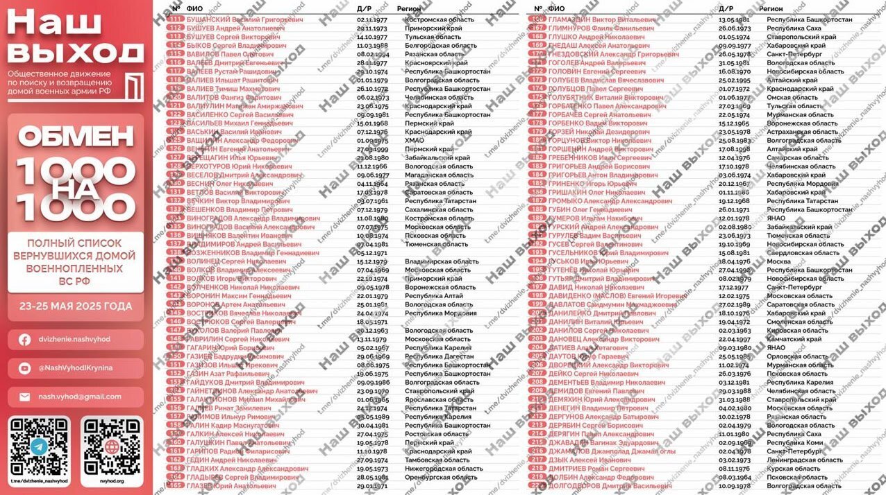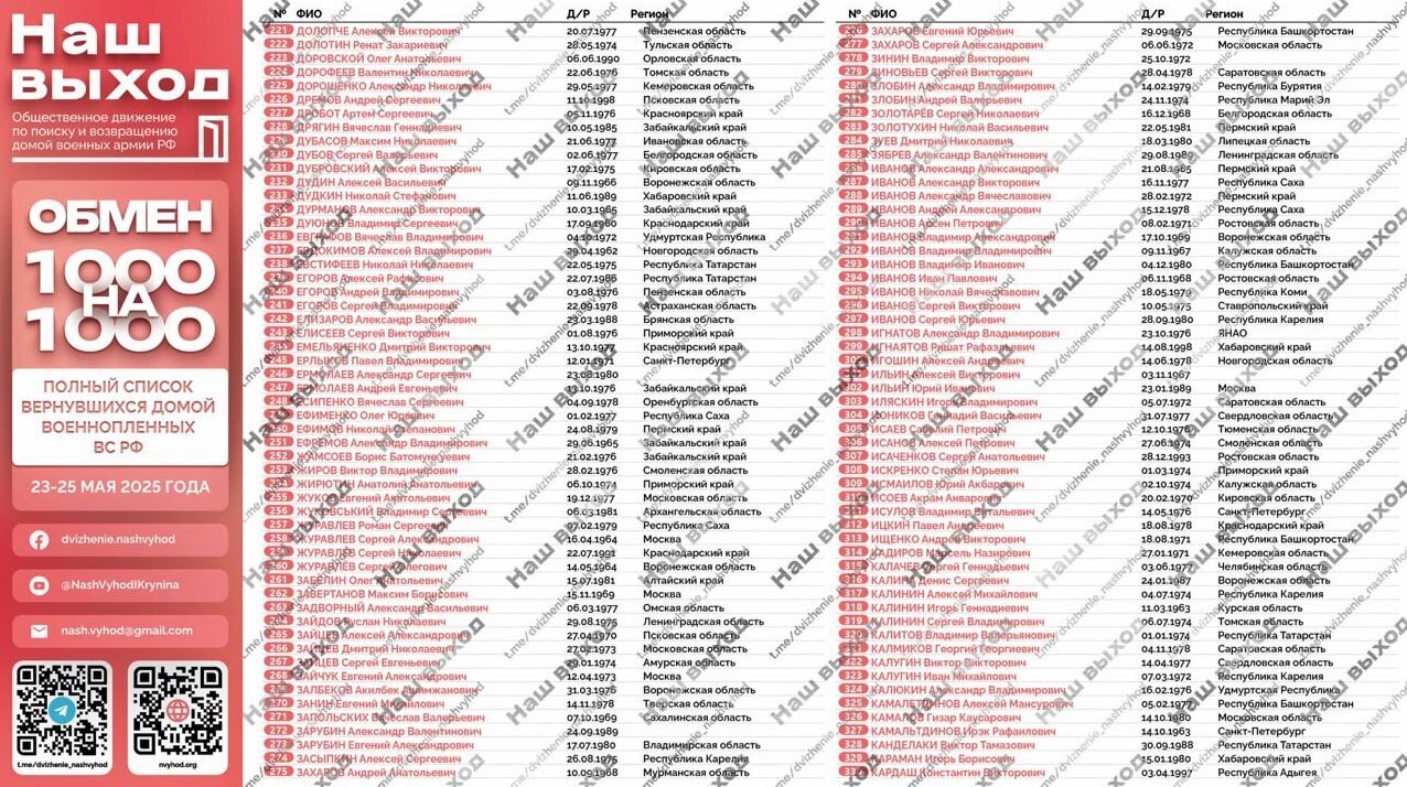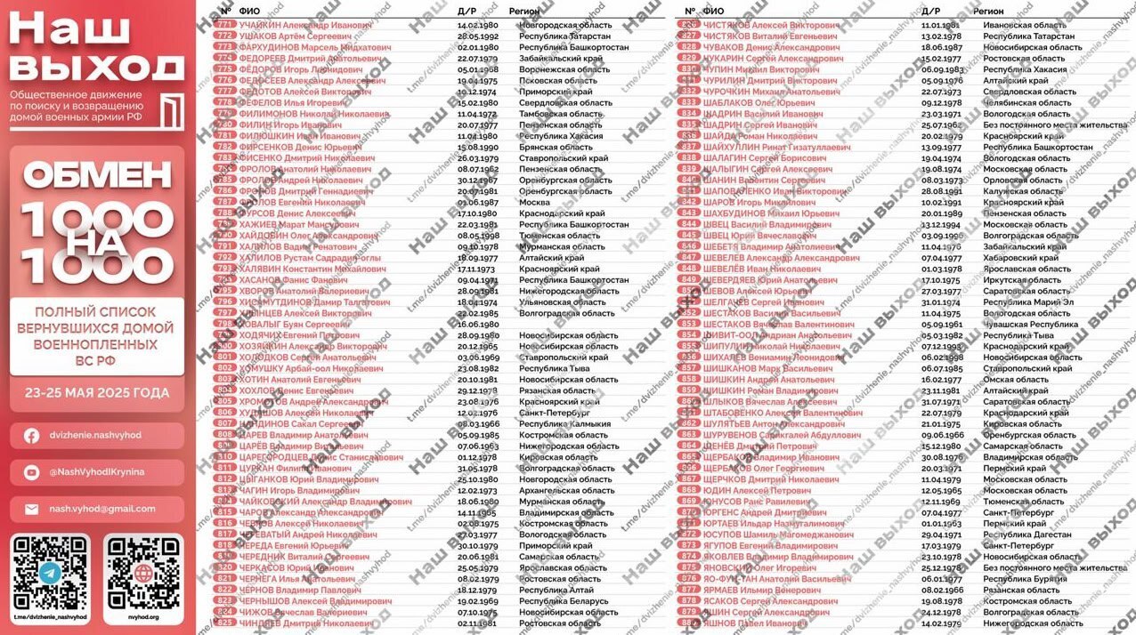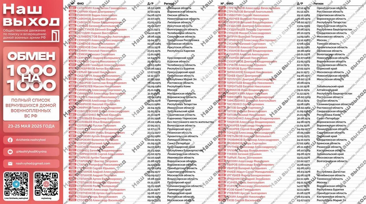 Опубликованы списки крупнейшего обмена пленными 1000 на 1000, который шел три дня : 23,24 и 2 5 мая 2025года.