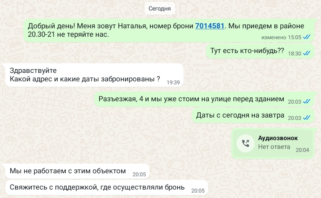 Спустя 5 часов мне соизволили ответить, спросив, какой адрес и даты. И внезапно сообщают, что с этим объектом они не работают. Муж перезванивает им на этот номер, мол вдруг ошибка. Нет, все та же нелюбезная девица сообщает, что идите ... в островок.
