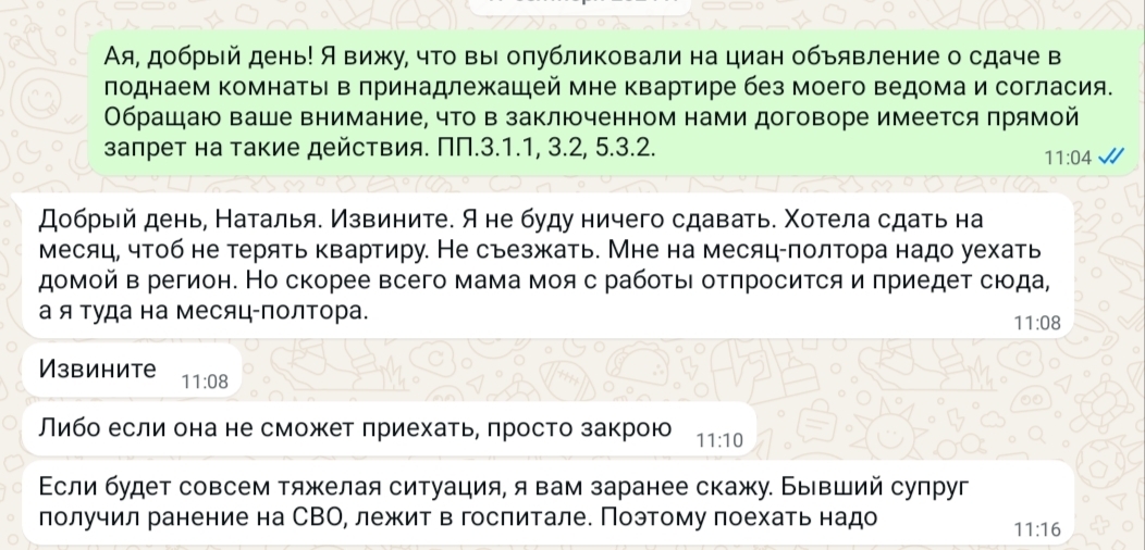 Дальше – больше. Посыпались сообщения в телеграм (от отставного сожителя) что "Мария на самом деле проститутка и в вашей квартире принимает клиентов, а одну из комнат в квартире сдала афганцам и они там живут вдесятером" и тому прочие гадости. Мы с мужем обеспокоились, однако соседи ни о чем подобном нам не сообщали, более того, по счётчикам было видно, что расход воды и электричества не изменился, чего не было бы, если бы реальность оказалась настолько ужасной. Далее мне снова стала писать квартирантка, что ее сожитель предлагает ей покинуть квартиру, что в квартире он будет проживать сам "с другом", а ее мол я выкину, потому что она чурка, а чуркам никто не сдаст (она из Бурятии), а вот он русский. Тут я написала обоим, что у меня договор с женщиной и в договор вписан ее сын-школьник, и никакого сожителя, и тем более с другом в моей квартире не будет. Наверное, тут хотелось проявить женскую солидарность и показать, что я не расистка. Именно в этом момент я продлила договор ещё на 11 месяцев.