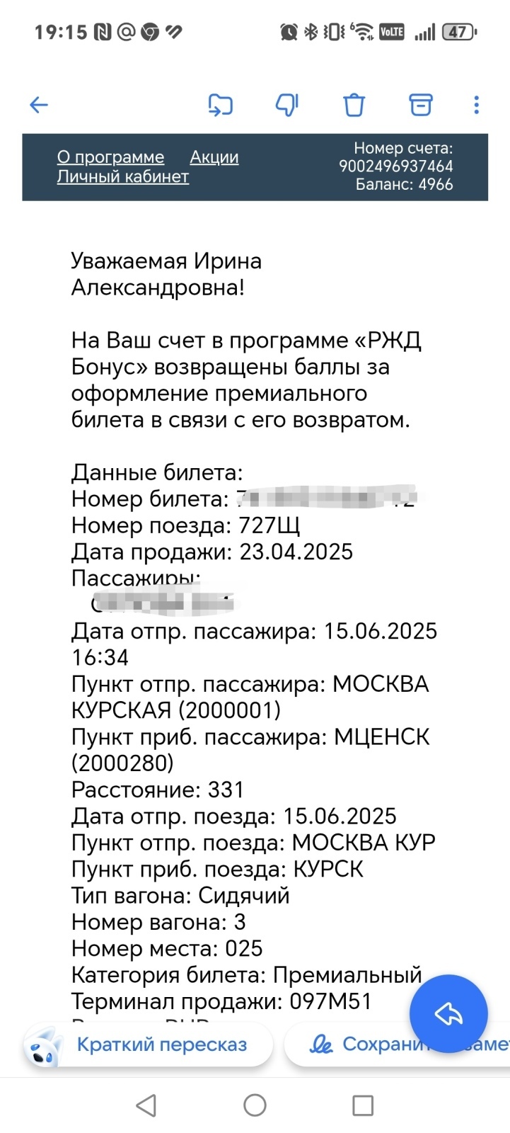 Правда, с одним билетом я ошиблась. Пришлось его вернуть. Но баллы за этот возвращенный билет вернули обратно.