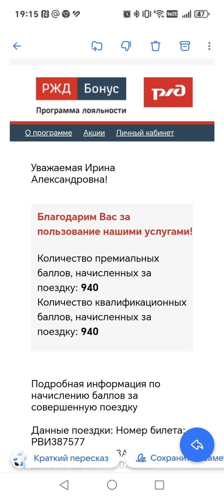 Я не часто езжу, но баллы все равно начисляют понемногу. Вот, к примеру, за недавнюю поездку в Санкт-Петербург мне начислили по 940 баллов за каждую поездку (туда и обратно).