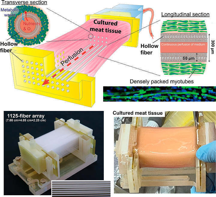 В проекте, которым руководит профессор Сёдзи Такеучи из Токийского университета, использовался биореактор с полыми волокнами, способный поставлять кислород и питательные вещества мышечным клеткам курицы, взвешенным в геле.