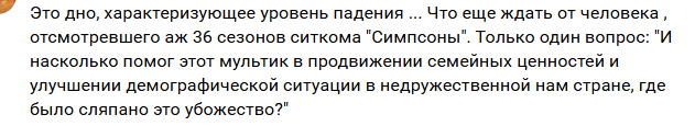 Интересно, а почему Батюшка на Запад смотрит? И почему он привёл в пример именно мультик про Симпсонов, где с точки зрения воспитательных целей не всё так гладко. Да он и совсем не для детей этот мультик, больше для взрослых. И почему митополит наши хорошие детские мультфильмы не вспомнил?