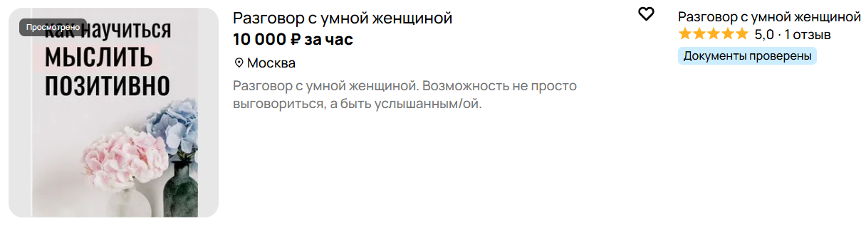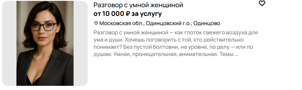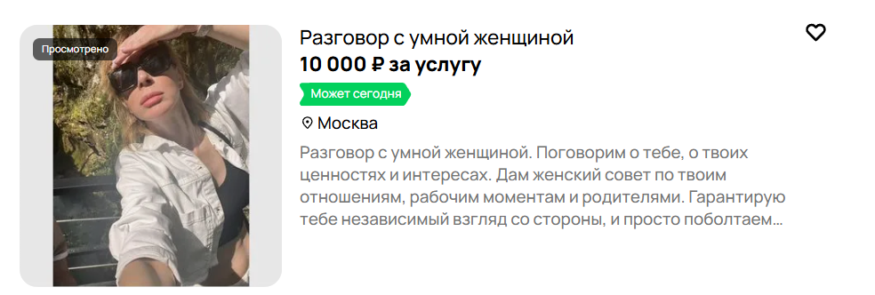 Девушка берёт по 10 тысяч за полчаса разговора — просто потому, что считает себя умной. Оригинальная услуга на Авито — разговор с умной женщиной