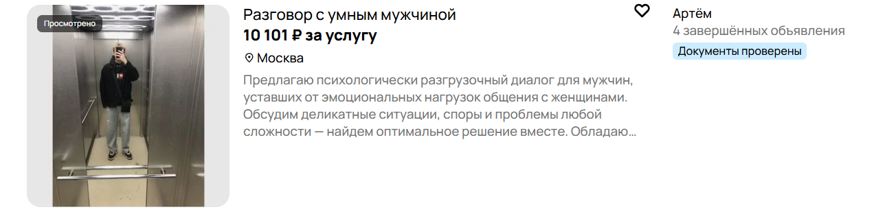 Парень предлагает услугу только мужчинам, которые устали от «эмoциoнaльных нaгpузoк oбщeния с женщинами». И утверждает, что обладает «выcoким уровнем интeллектa и aналитичecкогo мышлeния». Верим?