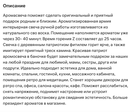 Давненько не было товаров с этим логотипом. Особенно впечатляет "патриот" аромат и предложения ставить этот уникум в спальне. Видимо авторы решили таким образом повысить рождаемость, причем с возможностью получить дополнительный ген от самого его превосходительства.