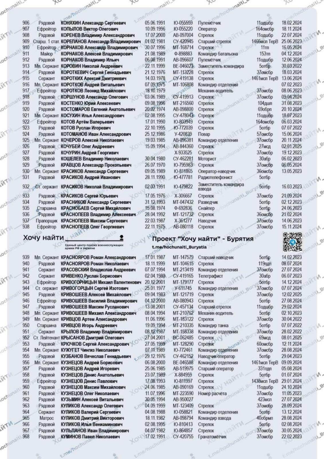 Вчера я опубликовала список военнослужащих 15 бригады, которая входила в состав второй общевойсковой армии по состоянию на начало 2025-го - в простонародье "Черная бригада". Уже сегодня появился список погибших из республики Бурятия, также по состоянию на начало 2025-го. Список включает как минимум 2030 погибших, но этот список не полный. Сюда не вошли все погибшие в 2022 году, а это значит, что реальные потери Бурятии в СВО значительно выше. В данном перечне указаны номера частей, жетоны, имена и даты рождения и смерти. Данные подтверждены Минобороны РФ.
