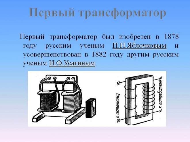 Яблочков- изобрёл трансформатор, конструкция которого не изменилась за 150 лет! Яблочков так же изобрёл электрический двигатель в 19 веке, он же начал продвигать идею электромобиля, с читая его гораздо дешевым и перспективным видом паспорта. Бензиновые двигатели активно проталкивали англия и США. Первый электромобиль в мире появился в царской России в конце 19 века, создатель даже успел сделать гараж электро электро такси работавших в городе..