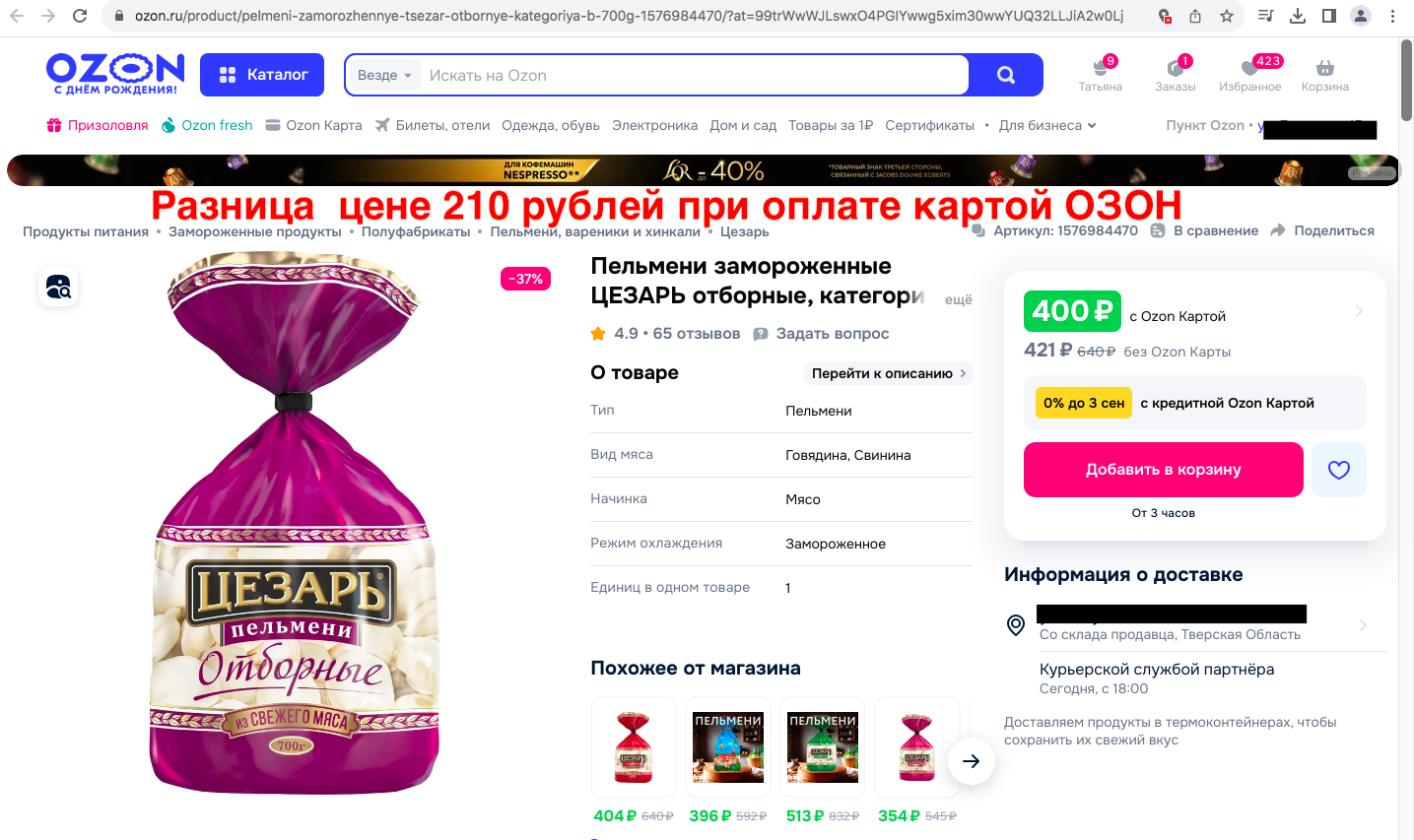 В данный момент на маркетплейс "ОЗОН" они стоят 400 рублей (если оплачивать картой ОЗОН), что более чем в 2 раза дороже той цены, по которой я покупаю эти пельмени в магазине ИКС.
