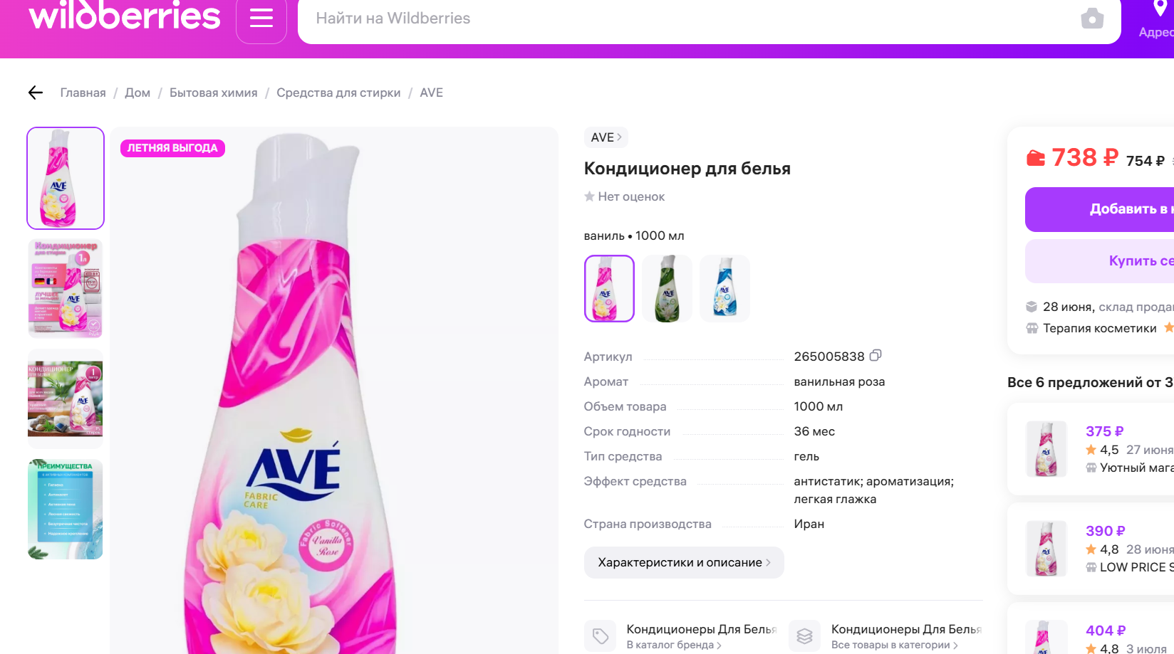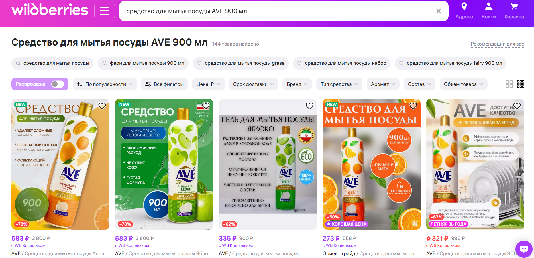 А средство для мытья посуды, за которое мы заплатили около 150 рублей, продаётся на Wildberries вот по таким ценам:
