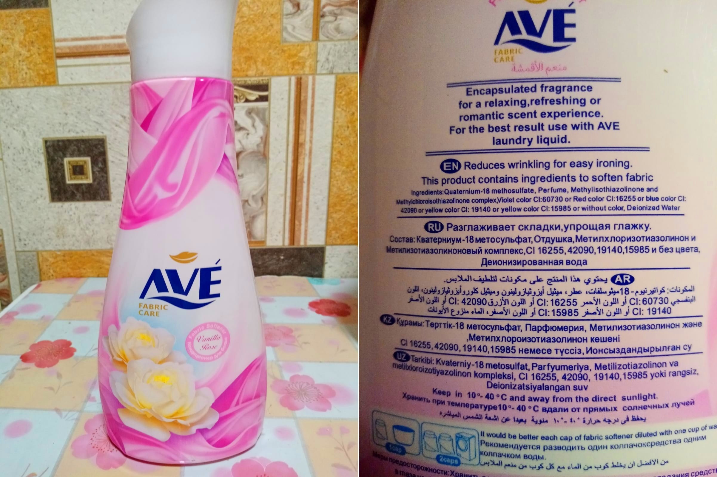 Кондиционер, ополаскиватель и антистатик в одном флаконе. Выбрали с ароматом ванильной розы. Тоже замечательное средство. При стирке добавляю всего половину колпачка.