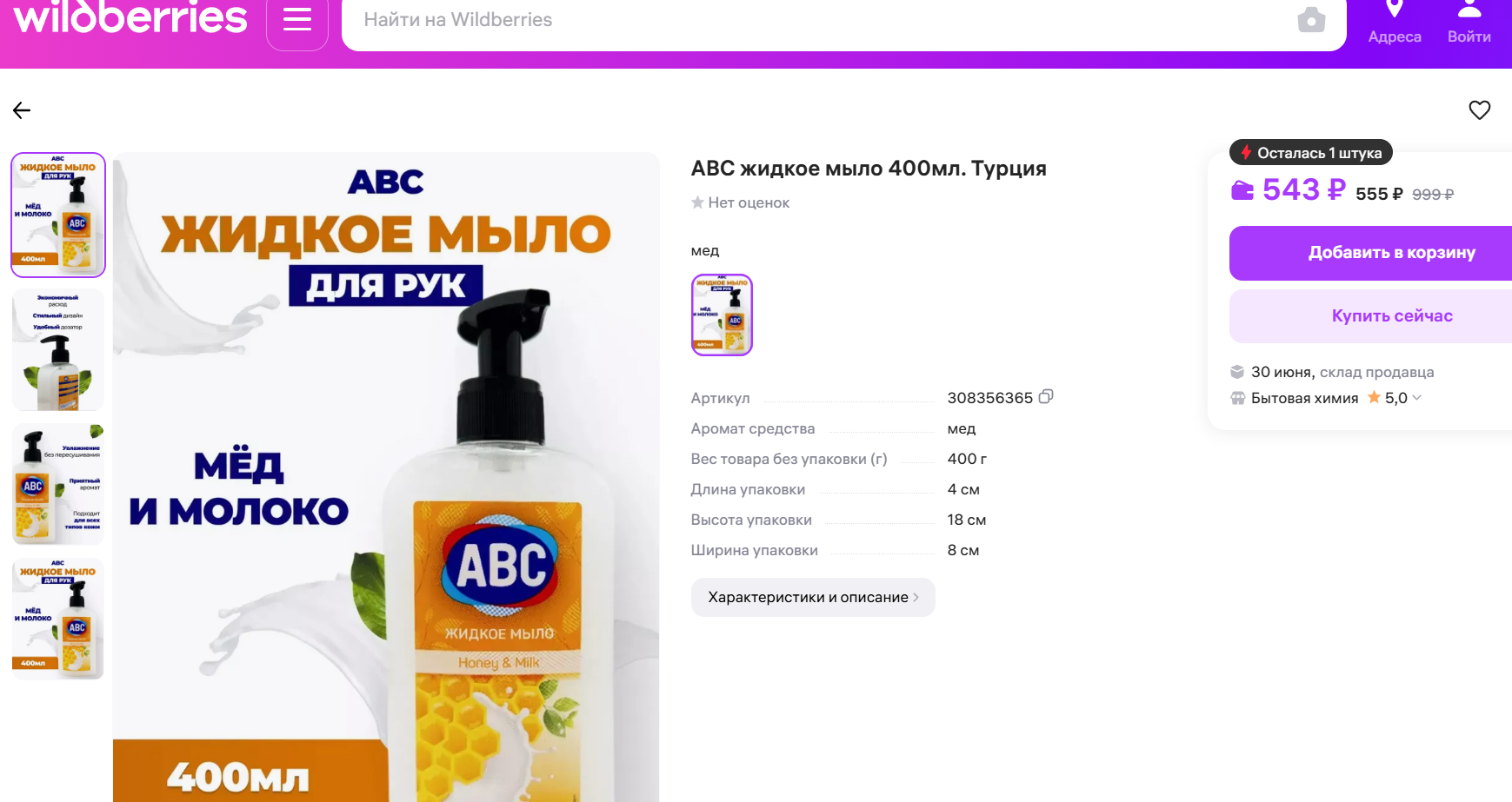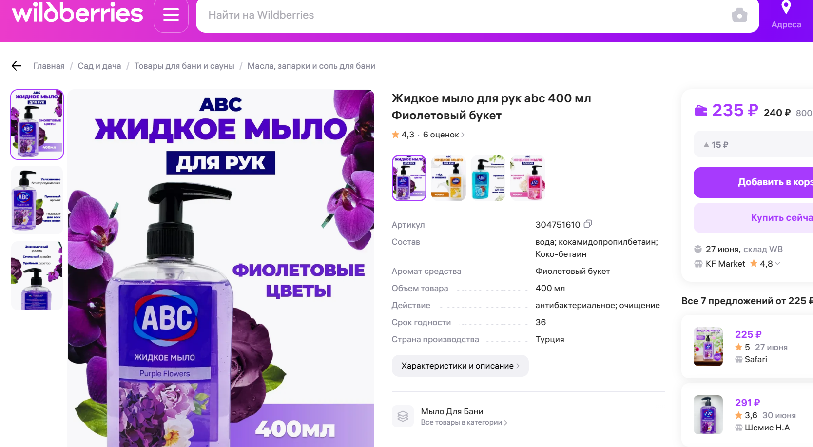 И очень я была удивлена, когда увидела точно такое же мыло (400 мл) на Wildberries, но по цене в несколько раз выше: