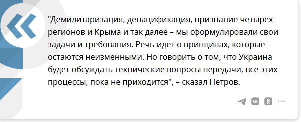 Политолог Вадим Петров считает, что на третьем раунде переговоров Украина вряд ли согласится на обмен пленными и телами погибших. Он думает, что Киев будет тянуть время и не захочет договариваться о важных вещах, чтобы закончить конфликт. Петров не ждёт, что на этот раз будут какие-то прорывы из-за позиции Украины.